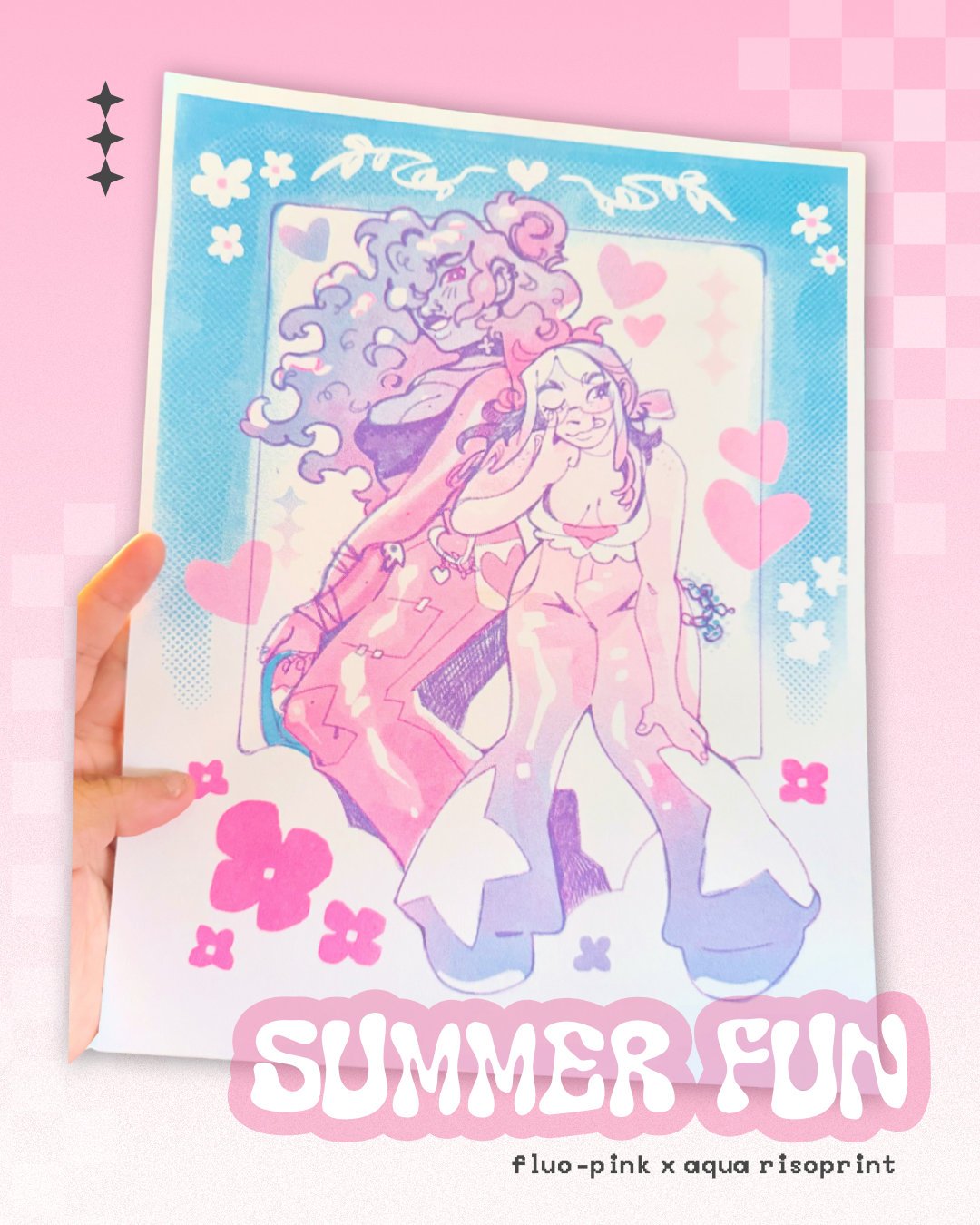 Summer fun, flower love — this risograph features fluorescent pink and aqua inks